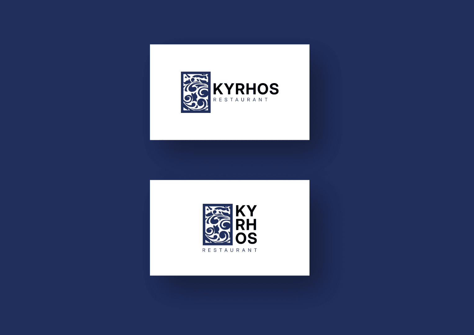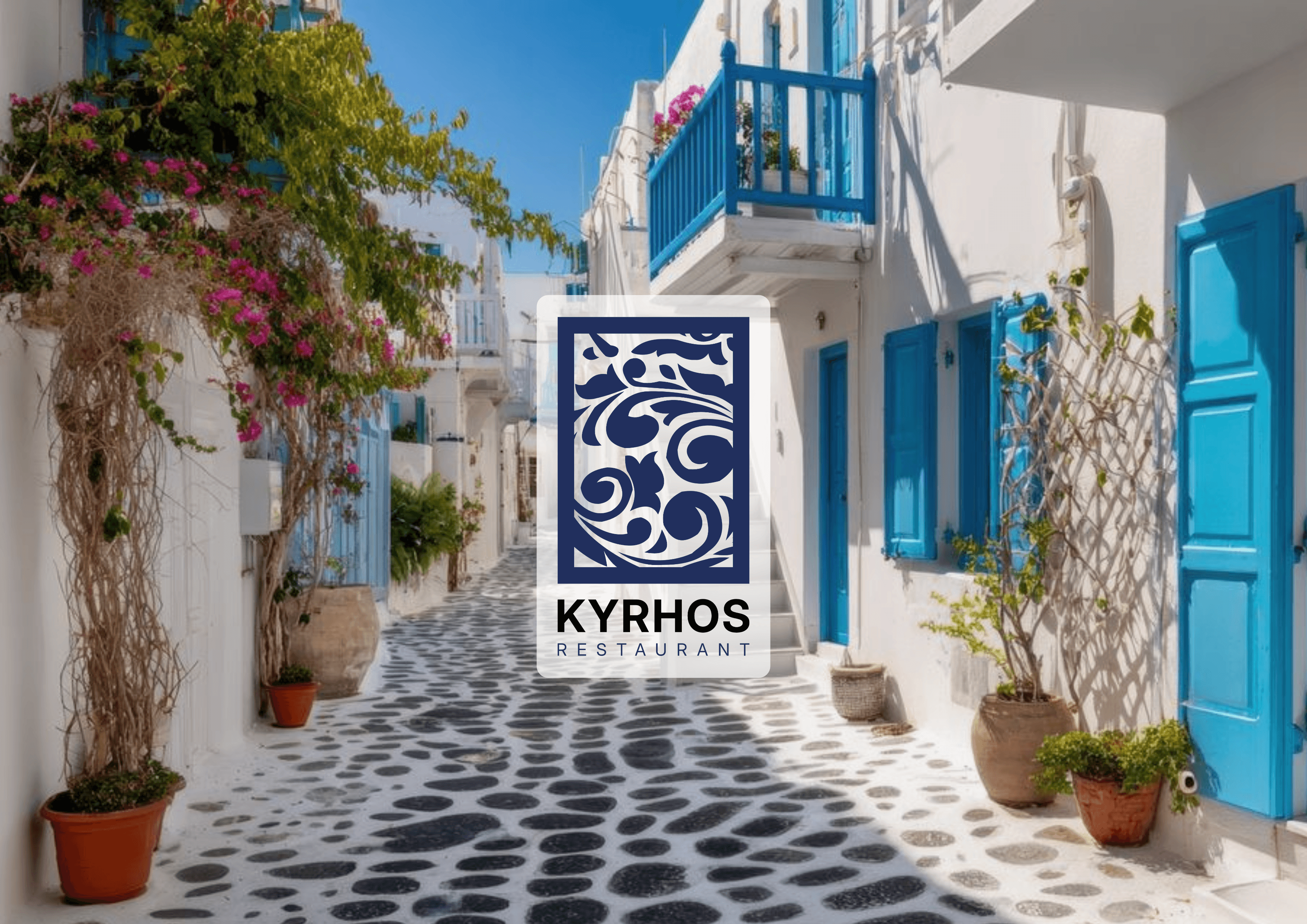 Kyrhos, un restaurant grec chic et contemporain, nécessitait une identité visuelle alliant authenticité et modernité. J'ai conçu la direction artistique, le logo aux motifs cycladiques et les wireframes du site web pour ancrer l'établissement dans un univers élégant et immersif.